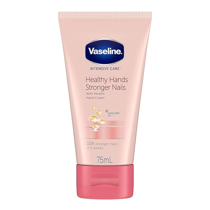 Vaseline Intensive Care Healthy Hands Stronger Nails 75ml is a specially formulated hand cream that provides deep hydration to very dry hands while significantly strengthening nails. Its powerful moisturizing effect combined with the strengthening benefits for nails provides a dual-action solution in one convenient product. To begin with, the formula features micro-droplets of Vaseline® Jelly that lock in moisture and speed up the skin's natural recovery process. Additionally, the hand cream is enriched with keratin, which works to make nails 10 times stronger within just two weeks of regular use.
